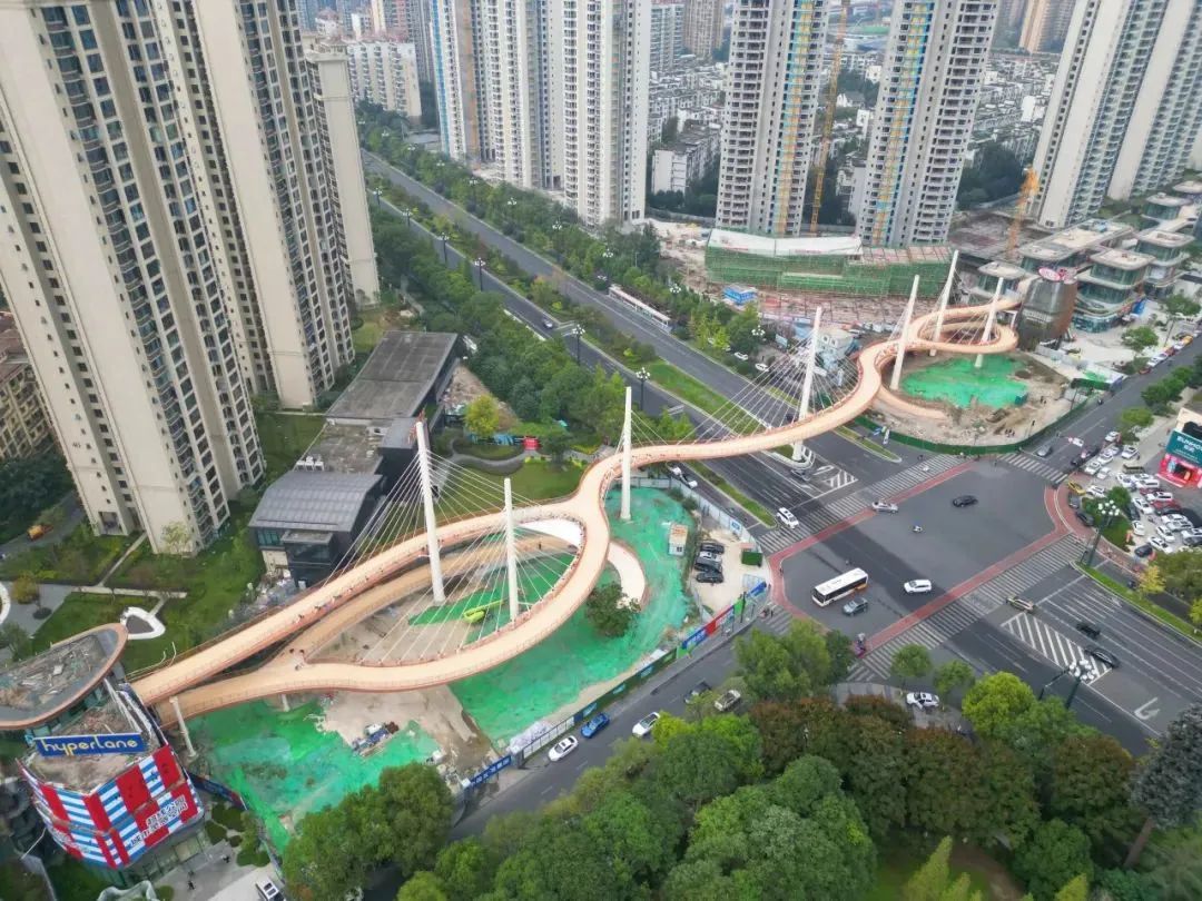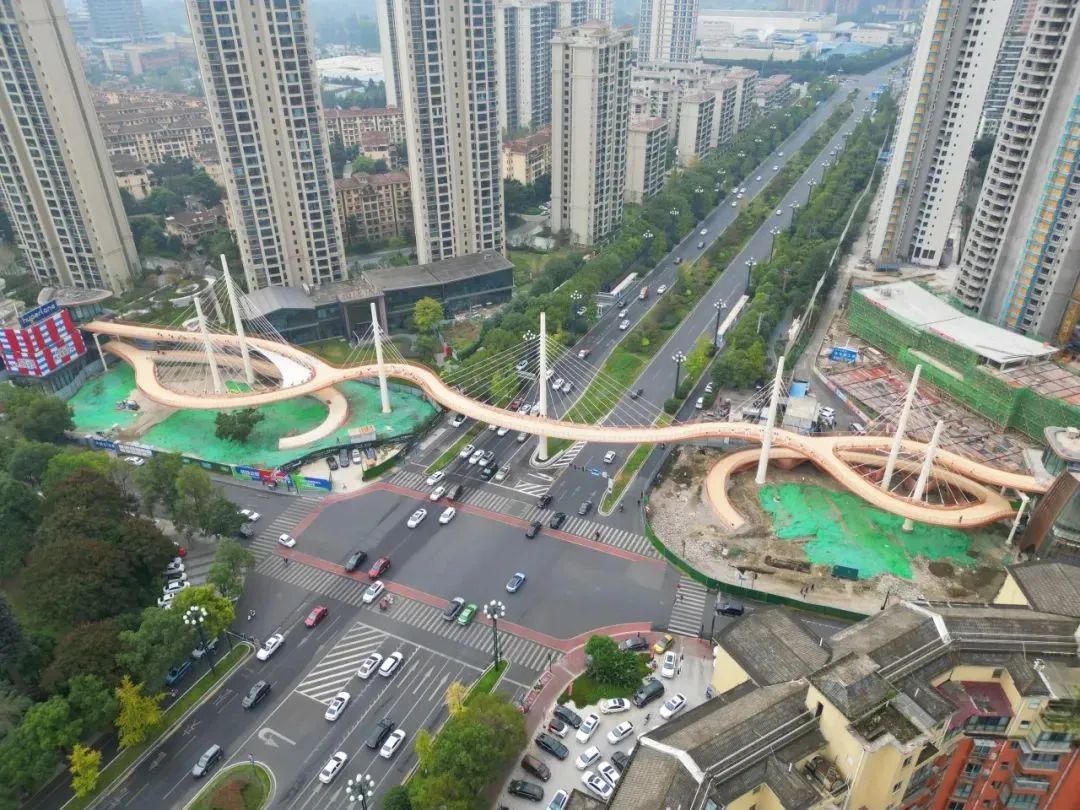 蜀龙路跨线桥主线全长(z𒈔hang)249.6米,共包罗7根索塔(ta)、100根钢(gang)索和24节段(duan)钢(gang)箱梁。全桥接纳钢(gang)布局完成(cheng)灵🦄活外型,不一(yi)座桥墩,经由过(guo)程7根索塔(ta)拉起1000余吨(dun)桥体。