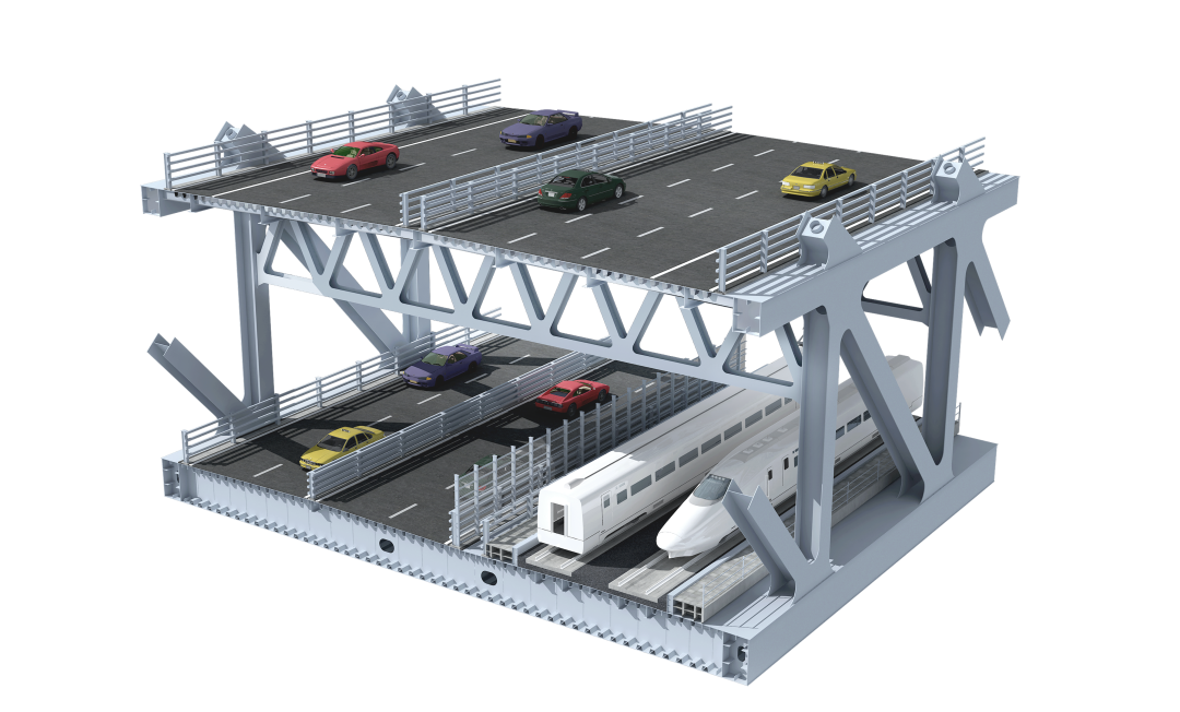 江大桥主河道桥钢梁接受双主桁“N”形钢桁梁,桁高15.5米,桁中距离35米,主桥钢梁在创意工厂内整节段设计、运送,全桥共91个大概小节段,节段总长度14米~28米,节段重量900吨~1856吨。