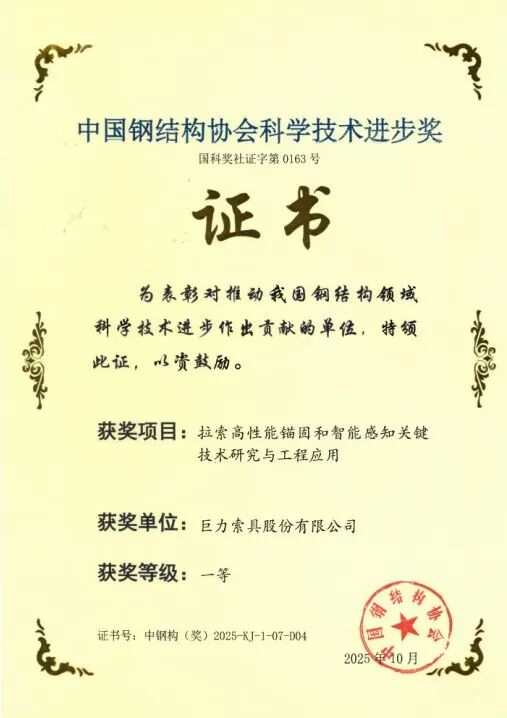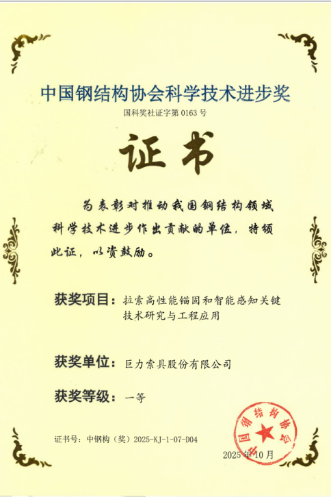 手艺立异再获权势巨子承认!巨力索具荣膺三项中国钢布局协会迷信手艺前进奖一等奖