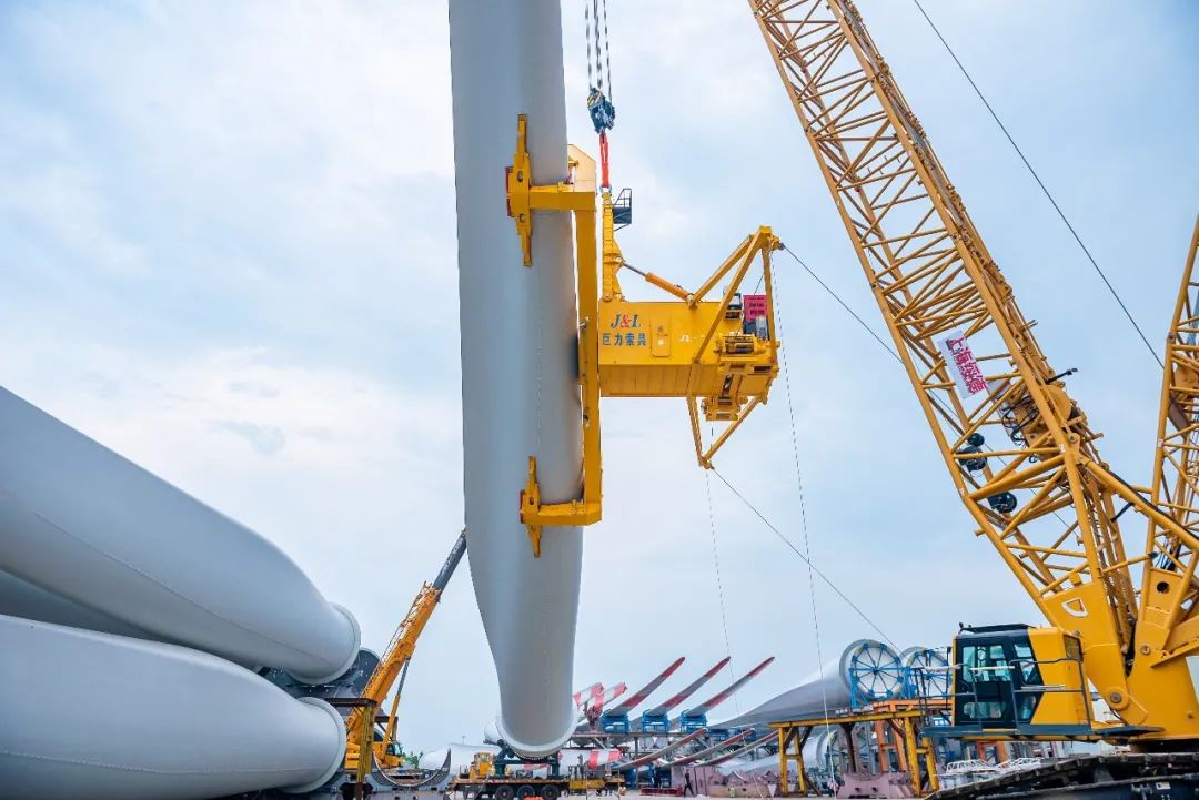 大兆瓦全角度海上单叶片吊具可知足单只叶片最大承重50吨。同时,将原本的吊装窗口平均风速晋升至15m/s,最大阵风风速可达18m/s,极大拓宽了风机吊装窗口期,冲破了海上吊装功课风速边境限定,是又一款海上风电单叶片吊装“利器”。